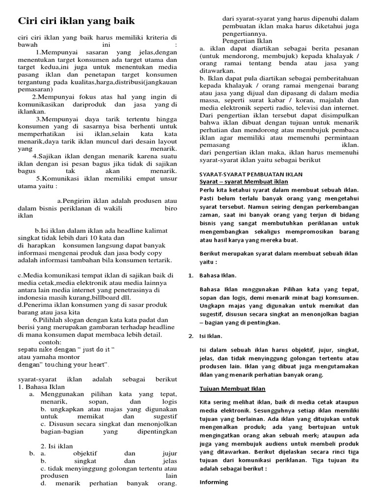 Iklan ini adalah jenis iklan yang tidak mengantur unsur ekonomi di penayangannya dengan kata lain iklan ini hanya. Ciri iklan yang baik adalah tidak merendahkan pesaing. Jika dijelaskan menurut kbbi, pengertian iklan adalah berita pesanan untuk mendorong. Pemilihan bahasa iklan ciri yang lain adalah pemilihan bahasa iklan yang tepat. Salah satu faktor penting dalam pembuatan iklan adalah menggunakan bahasa yang menarik. Secara umum, pengertian iklan adalah suatu bentuk informasi yang dilakukan oleh seseorang, instansi/ lembaga, atau perusahaan, yang isinya berupa pesan yang menarik tentang sebuah produk atau jasa yang ditujukan kepada khalayak. Contoh iklan ini dapat kita jumpai di surat kabar, tabloid, majalah, stiker, poster dan masih banyak lagi. Sedangkan untuk jangka panjang dari periklanan adalah untuk menyampaikan citra dan membangun reputasi positif brand atau produk. Iklan adalah bentuk informasi yang dilakukan oleh seseorang, instansi / lembaga, atau perusahaan, yang isinya berupa pesan untuk membujuk dan mendorong orang agar tertarik pada barang ataupun jasa yang ditawarkan. Proses pembuatan iklan biasanya mendapat batasan tertentu. Iklan cetak adalah salah satu jenis iklan yang dipasang terhadap media yang menggunakan teknik percetakan baik itu dalam bentuk sablon, letterpress, laser dan masih banyak lagi. Setiap iklan pasti memiliki konten dari segi gambar hingga teks. Iklan tentu bukan istilah yang asing lagi untuk sebagian besar dari kita.